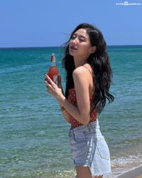 해변에서 꽃무늬 수영복 + 청핫팬츠 시원한 몸매 정예인