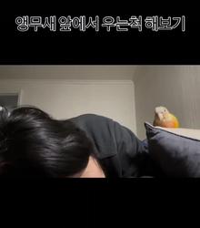 앵무새 앞에서 우는 척 하는 여자